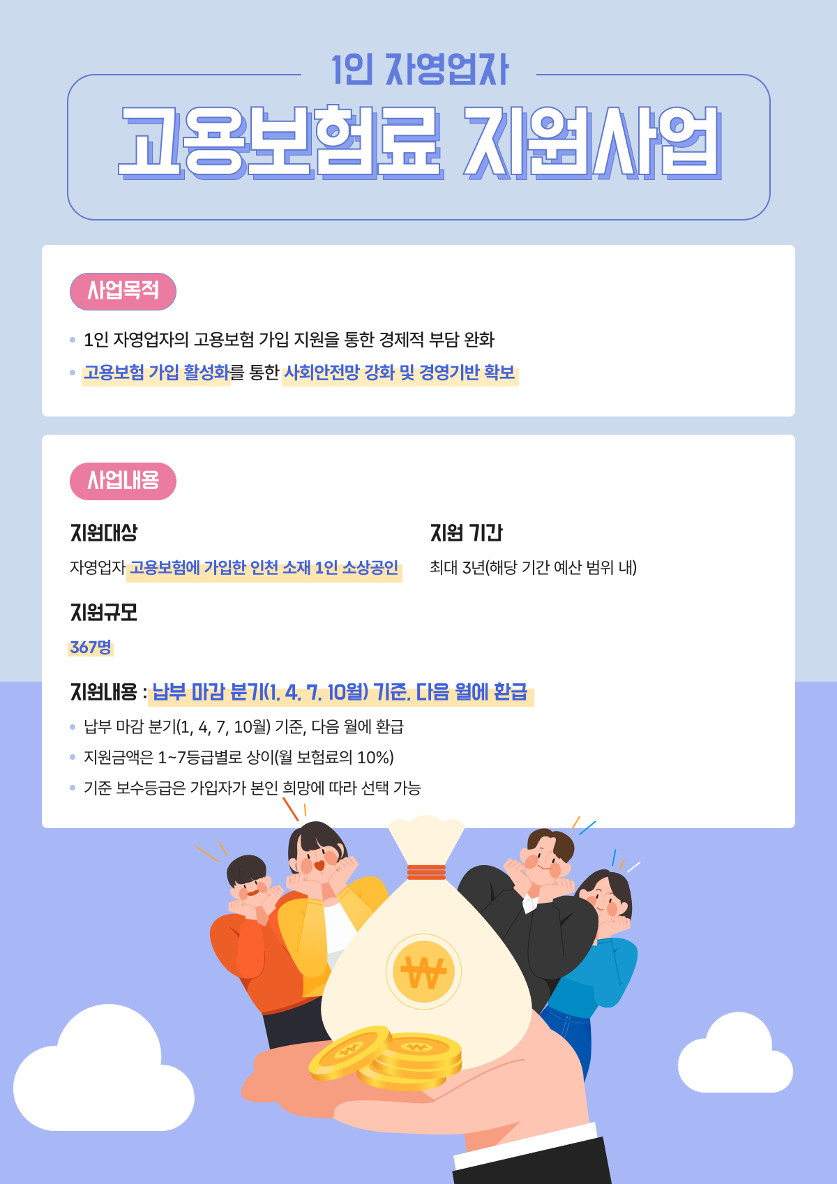 자영업자 고용보험(1~7등급)에 가입한 고용원이 없는 인천시 내 1인 소상공인에게 납부 고용보험료의 10%를 환급 지원합니다.